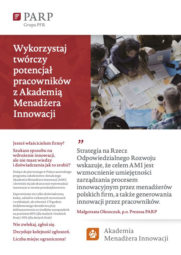 The Academy of the Innovative Manager is an original training and consulting programme of the Polish Agency for Enterprise Development, co-financed by the European Union. Its aim is to equip managers and employees of enterprises, with the competences necessary to manage the change process, which leads to the implementation of innovations. The programme was created in co-operation with the best business practices in the field of modern business management and the implementation of innovations. It provides participation in interesting workshops and lectures, but also 170 hours of dedicated consultancy work.