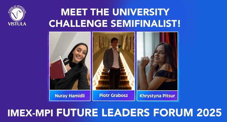 We are proud to announce that three talented students from Vistula School of Hospitality have been selected as semifinalists in the prestigious IMEX-MPI University Challenge 2025 – one of the most renowned competitions for future leaders in the meetings and events industry.