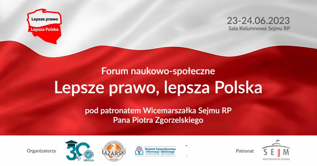 Serdecznie zapraszamy do współpracy w ramach dwudniowego Forum Naukowo – Społecznego „Lepsze prawo, lepsza Polska”, organizowanego przez Uczelnię Łazarskiego w Warszawie – Centrum Badań Procesu Legislacyjnego, Akademię Finansów i Biznesu Vistula w Warszawie, Uniwersytet Warszawski – Wydział Dziennikarstwa, Informacji i Bibliologii, pod patronatem Wicemarszałka Sejmu RP Piotra Zgorzelskiego.