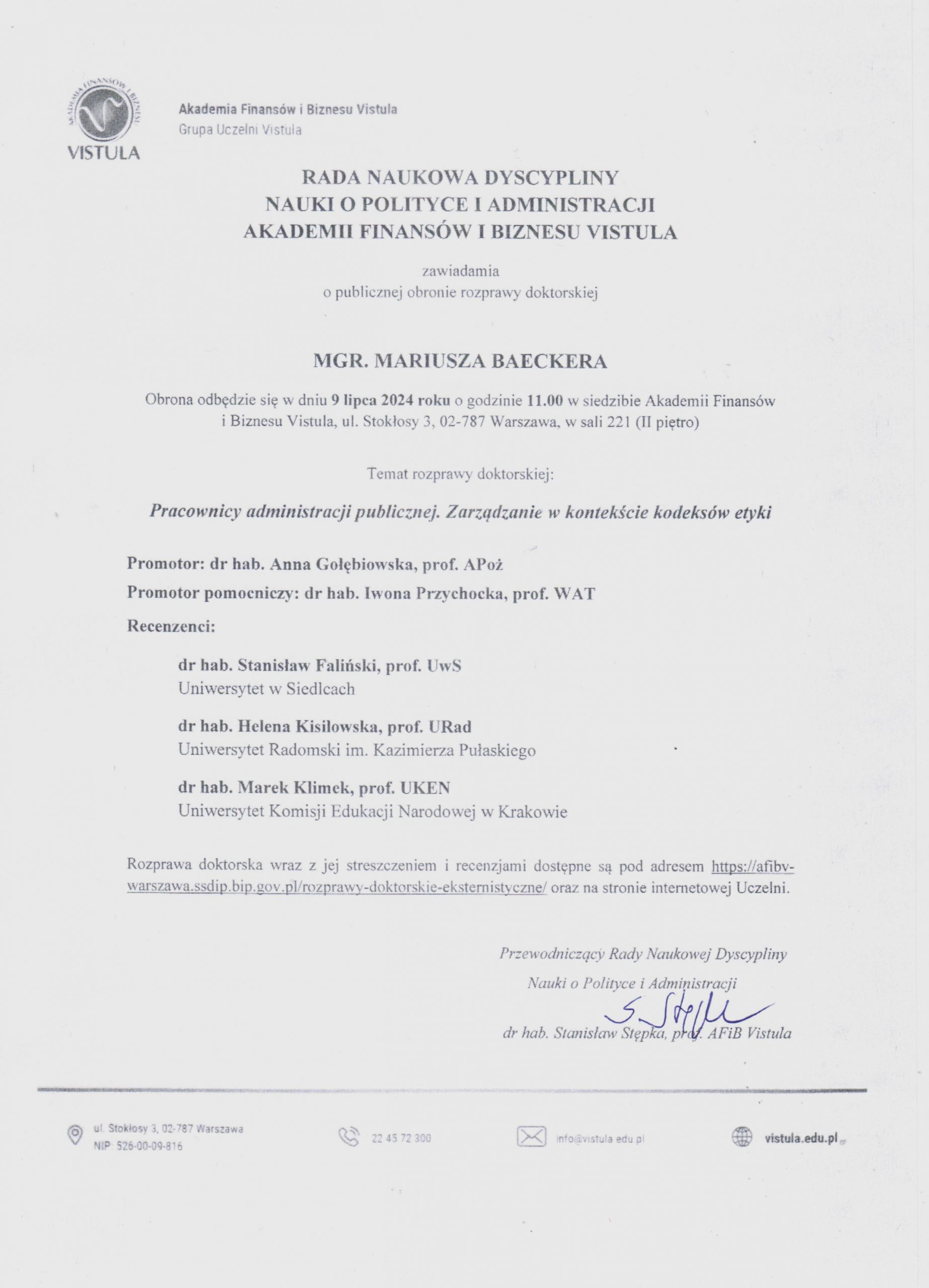 W sprawie postępowania o nadanie stopnia doktora w dyscyplinie nauki o polityce i administracji, prosimy o kontakt mailowy na adres nauka@vistula.edu.pl.Jednocześnie uprzejmie przypominamy zainteresowanym osobom, że zgodnie z ustawą Prawo o Szkolnictwie Wyższym i Nauce, przewody doktorskie wszczęte na zasadach obowiązujących przed wejściem w życie nowej ustawy, należy zakończyć przed 31 grudnia 2024 r. Przewody niesfinalizowane do tego dnia zostaną zamknięte.