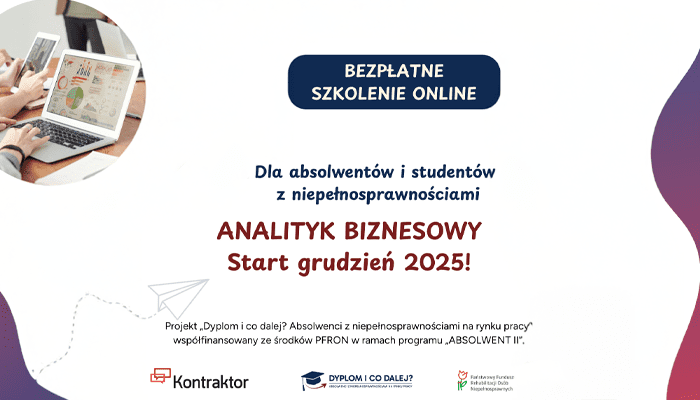 W ramach projektu „Dyplom i co dalej? Absolwenci z niepełnosprawnościami na rynku pracy”, współfinansowanego ze środków PFRON w programie „ABSOLWENT II”, rusza bezpłatne szkolenie online „Analityk biznesowy” połączone z możliwością odbycia płatnego stażu i uzyskania wsparcia w wejściu na rynek pracy. Absolwenci i studentki/studenci ostatnich lat studiów z niepełnosprawnościami mogą skorzystać z wyjątkowej szansy rozwoju zawodowego.
