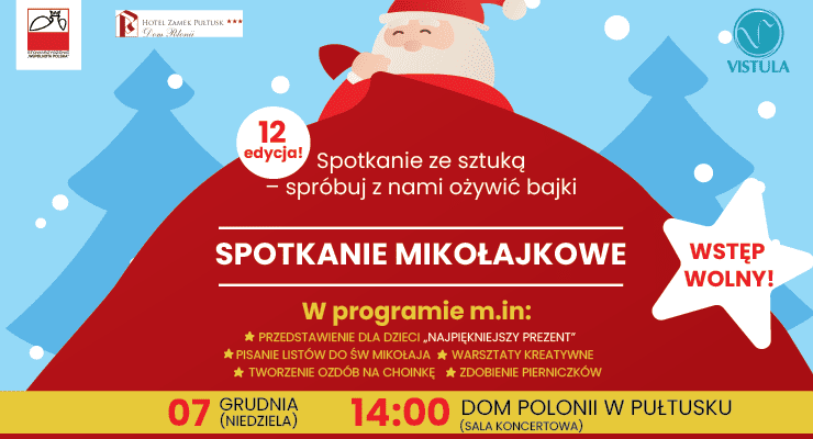 Dom Polonii w Pułtusku, we współpracy z Akademią Finansów i Biznesu Vistula Pułtusk, zaprasza na kolejną świąteczną edycję wydarzenia z cyklu „Spotkania ze sztuką – spróbuj z nami ożywić BAJKI”. W niedzielę 7 grudnia 2025 r. o godz. 14.00 w Sali Koncertowej Domu Polonii odbędzie się wyjątkowe Spotkanie Mikołajkowe pełne magii, kreatywności i dobrej zabawy. Wstęp jest wolny.
