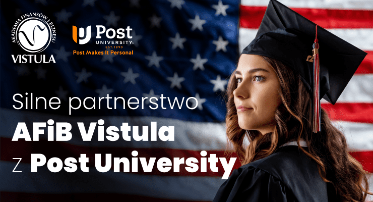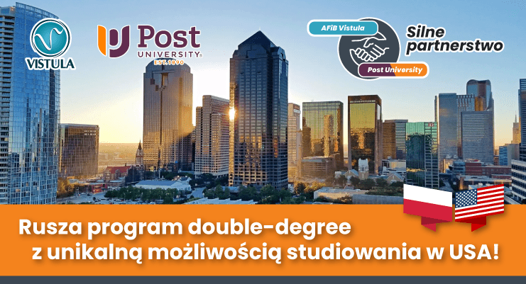 Akademia Finansów i Biznesu Vistula ogłasza uruchomienie programu podwójnego dyplomu na kierunkach Zarządzanie oraz Finanse i rachunkowość, realizowanego we współpracy z uznanym amerykańskim Post University. Innowacyjna formuła pozwala studentom w ciągu czterech lat uzyskać dwa dyplomy licencjackie – europejski dyplom AFiB Vistula oraz amerykański Bachelor’s degree Post University.